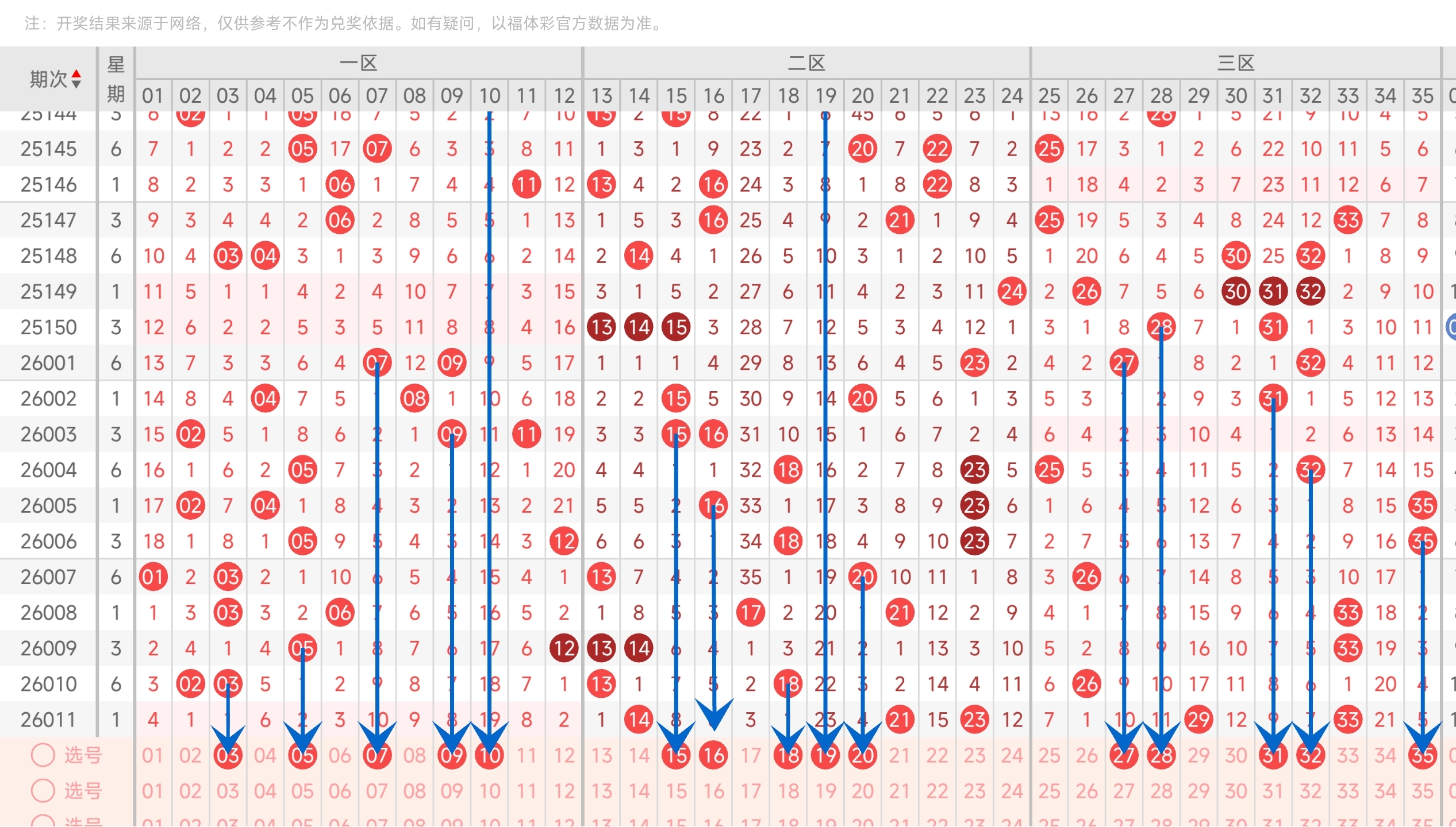 上期开出29和33号码,往前一期开出了26号。通过分析走势图,可以看到上期凤尾开了33,凤尾开了右边,本期凤尾可能继续开右边的号码,其次是防一下左边的号码,所以本期主要关注左右两边的号码,防中间的。最后再结合冷热号和遗漏期数,本期我们可以关注27,28,31,32,35等号。综上所述本期三区我们推测可能会开27,28,31,32,35等号码。
