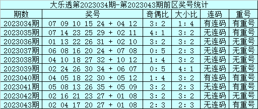上期回顾:体彩大乐透第23043期奖号开出:02 04 17 20 27+01 08,前区奖号奇偶比为2:3,012路比为1:1:3,大小比为2:3,没有开出连码,包含2个重号:02、27。