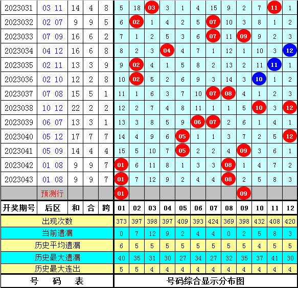 后区分析:上期后区奖号为01和08,最近10期后区各号码频次为:号码08、12出现3次,01、02、05、07、10出现2次,04、06、09、11出现1次,其中号码03没有出现,本期后区参考号码01、02、06、09、10、11,单注参考01+09。