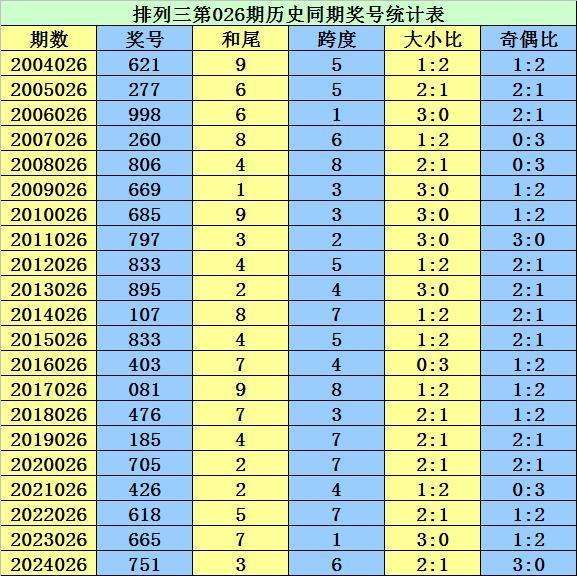 从2004年至今排列三已开出7149期奖号了,本期为排列三2025年第026期开奖,历史同期已出现21次奖号: