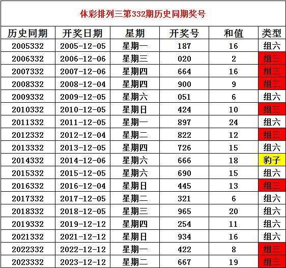 2024年12月11日排列三第332期开奖,历史同期分别开出奖号: