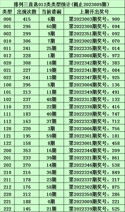 上期回顾:体彩排列三第2023009期开出奖号:221,其012路比为0:1:2,奖号012路类型为:221。