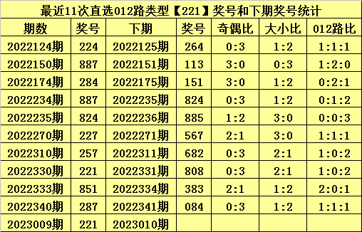 排列三上期开出奖号为:221,其直选012路类型为221,历史上直选221号码已开出了188次,最近11期分别开出奖号为:224、887、284、887、824、227、257、221、851、287、221。