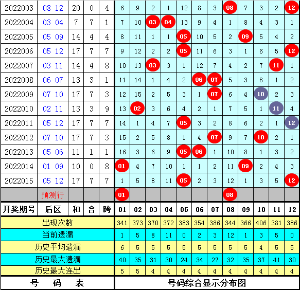 后区分析:后区上期开出号码05+12,和值为17,跨度为7。最近10区后一区(01-06)开出9个号码,断区2次,后二区(07-12)开出11个号码,断区1次,本期后一区注意号码:01、02、03;后二区注意号码:08、11、12。