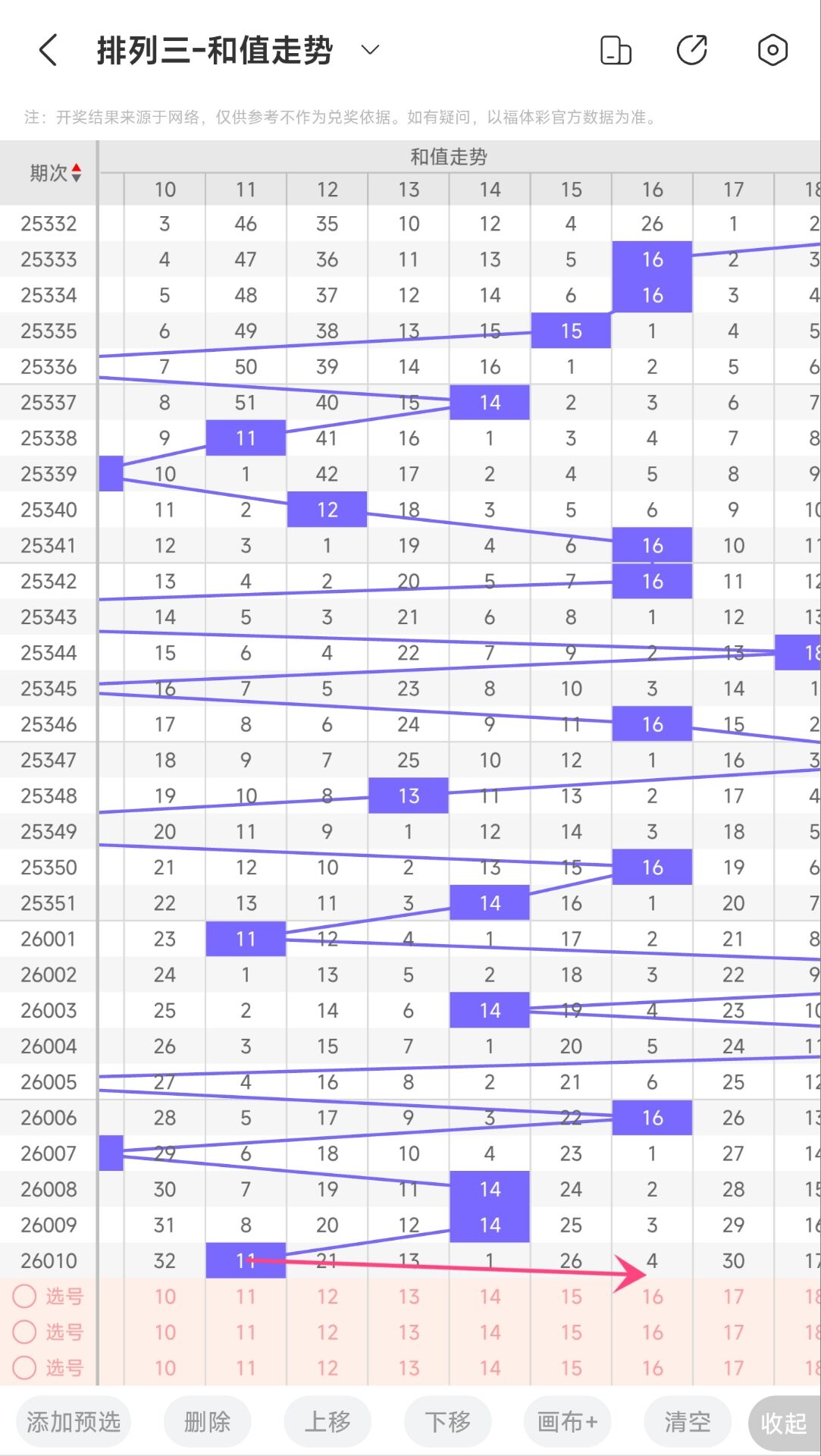 上期和值为11,往前一期和值为14,趋势往左移动,偏移量为3。通过走势图分析,11和值是近30期内开出比较小的和值,下降空间比较小,上升空间比较大。本期看好和值变大,因此推测本期趋势是往右的,和值会变大,小概率往左,和值变小。