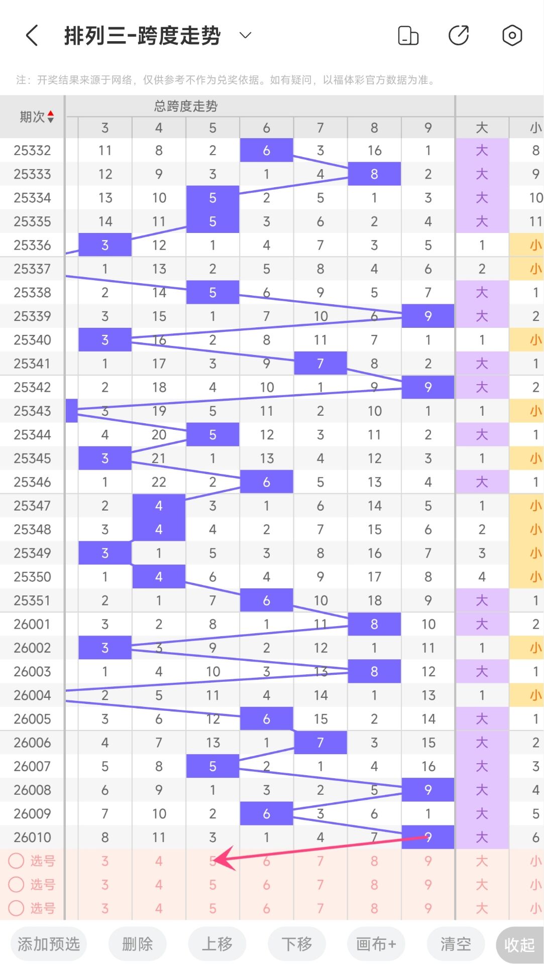 上期跨度为9,往前一期跨度是6,趋势往左移动,偏移量为3。跨度值9时,跨度值是近30期内开出最大的值。通过走势图分析,目前的趋势是大概率往左。所以推测本期跨度可能为45678等跨度。