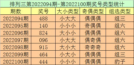 排列三第2022100期回顾:奖号444,奇偶比0:3,大小比0:3,和值12,类型:豹子。