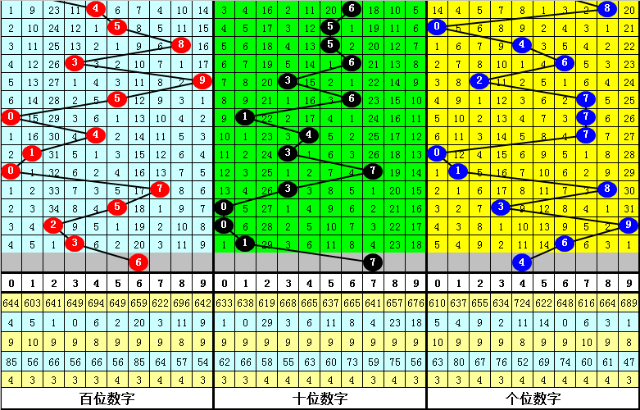 百位:近期大小号码出现次数基本相当,小号目前连续开出2期,本期不看好小号,注意大号回补;另外,该位0路和1路号码在最近18期奖号中走势较热,2路号码表现相对较冷,本期该位放弃2路号码,参考号码6。