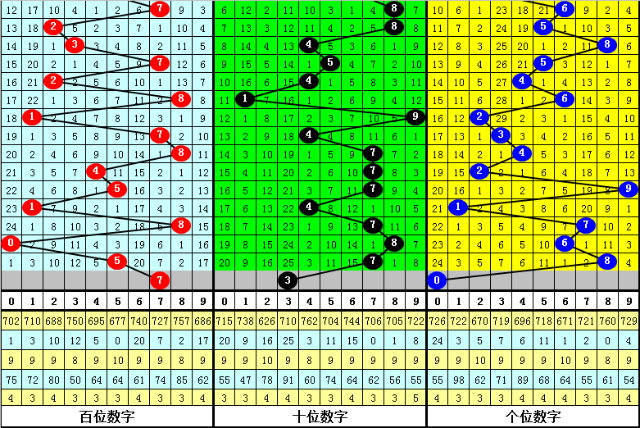百位推荐:近10期出现1个0路号、4个1路号、5个2路号,2路号大热,0路号走势低迷。本期注意1路号,关注号码4、7。