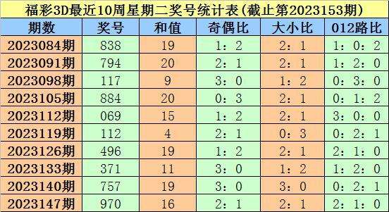 福彩3D第2023147期(上周星期二)奖号为970。其中奖号奇偶比为2:1,大小比为2:1,012路比为2:1:0。