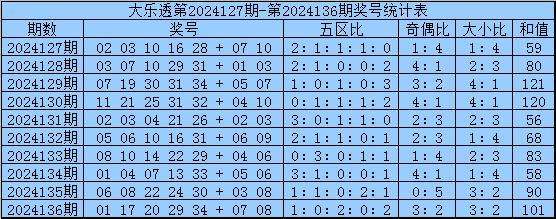 和值:最近30期和值出现范围在47-138之间,振幅为91个点位,最近10期和值开出范围在56-121之间,振幅为65个点位,上期前区和值为 101,上升11个点位,本期预计和值上升,出现在130附近。