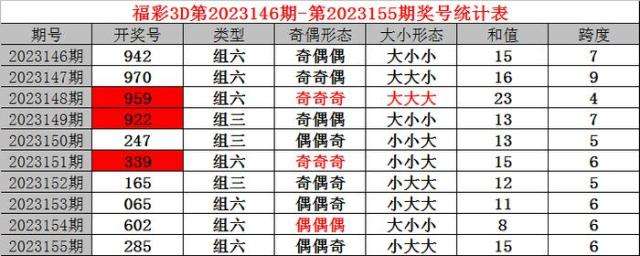 上期回顾:福利彩票3D第2023155期开奖结果285。奖号:偶偶奇、小大大,和值15,跨度6。