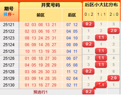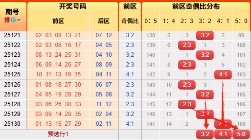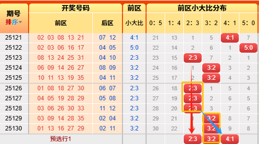 上期前区小大比3:2,命中啦,近期统计57期中51期。言归正传我们继续用历史数据说话,前区小大比分成6种0:5、1:4、2:3、3:2、4:1、5:0(如图),我统计了一下历史出现次数,0:5出现106次、1:4出现513次、2:3出现969次、3:2出现807次、4:1出现350次,5:0出现53次,再看近10期小大比出现次数比为0:0:4:4:1:1,通过历史数据对比观察以及根据遗漏对称理论原则,故本期我们选择2:3、3:2、4:1;(具体精准方向请查看小车小大比精选)