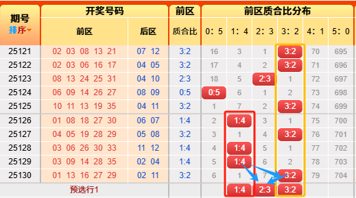 上期质合3:2,命中啦,近46期命中44期范围。来看历史次数统计0:5出现269次、1:4出现904次、2:3出现1006次、3:2出现512次、4:1出现100次、5:0出现7次,再看近十期质合比出现的次数比1:3:1:5:0:0,冷值5:0暂时放弃,再结合图形来看,本期趋势看顺路,初步选择为3:2、1:4、2:3。(具体请点击本条上车查看精选质合比 )