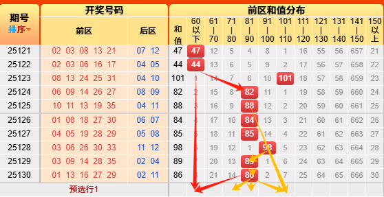 上期开出和值88。本次我们先根据历史次数统计,和值60以下开出246次、61-70开出234次、71-80开出367次,81-90开出482次、91-100开出491次,101-110开出380次、111-120开出312次、121-130开出155次、131-140开出90次、141-150开出26次、150以上开出9次,再来看近十次以上和值分别开出了2次、0次、0次、6次、1次、1次、0次、0次、0次、0次、0次 ,低于阈值的有60区间以下、61-70区间、81-90区间、91-100区间、101-110区间、121-130区间,再根据遗漏斜率对称理论,本期注意60以下区间、71-80区间、101-110区间、81-90区间。