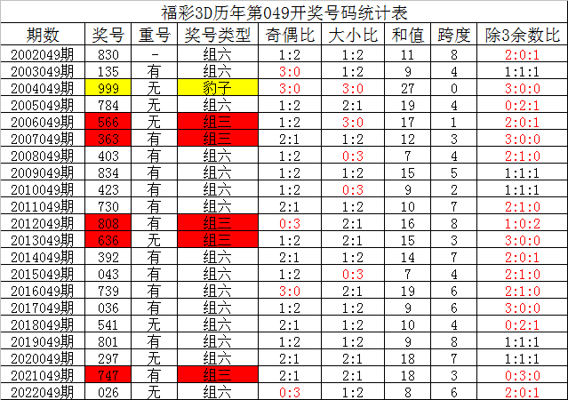 其中,组三号码开出3次,组六号码出现17次,上期奖号为组六号码,本期预计继续开出组六号码。