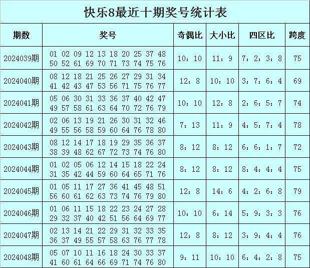 福彩快乐8第2024048期开奖回顾:05 07 10 11 16 18 24 30 33 37 41 60 61 64 66 69 71 74 76 80,其中奖号奇偶比开出9:11,大小比开出10:10,四区比开出6:4:2:8,跨度开出75。