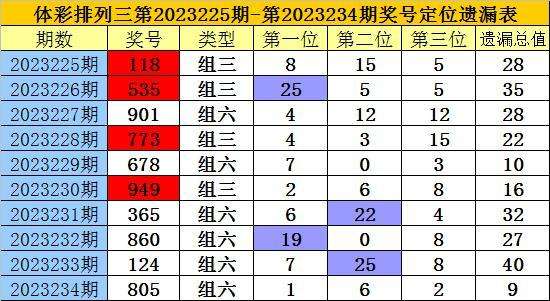开奖回顾:排列三第2023234期奖号为:805,各位号码遗漏值分别为1、6、2,遗漏总值为9。