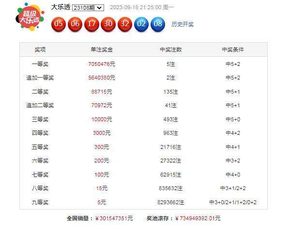 大乐透第23108期开奖。当期开奖号码为:前区05 06 17 30 32,后区02 08。当期前区号码大小比为2:3,奇偶比为2:3,三区比2:1:2,前区开出1组连号05 06;后区开出小大组合02 08。