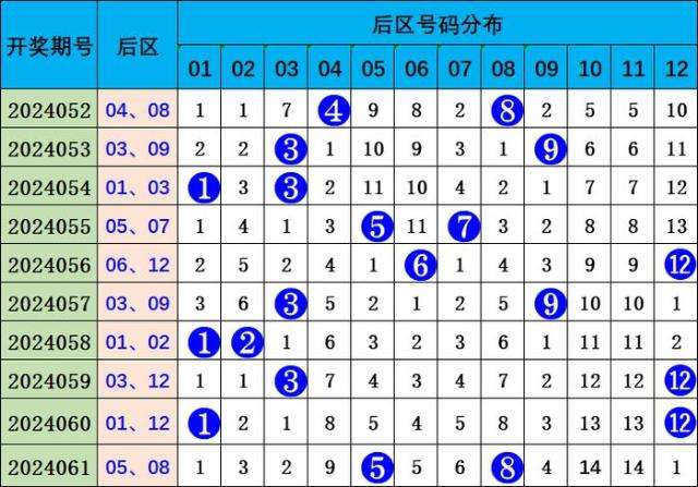 大乐透第2024061期出奖号统计:前区01 12 19 31 33,后区05 08,和值为96,跨度32,龙头01凤尾23,三区比为2:1:2,012路比为2:3:0,奇偶比为4:1,大小比为3:2,冷热比为3:2,0枚重号,0组连号。