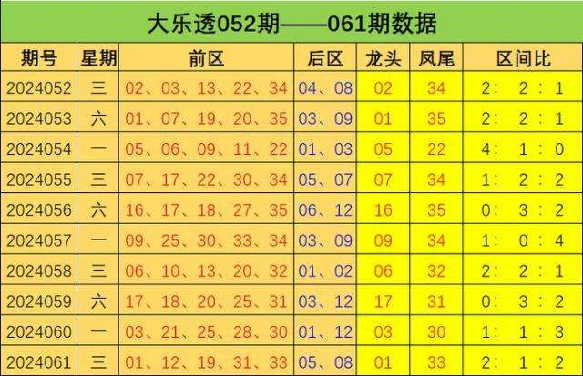 062期李杰大乐透预测奖号:龙头凤尾区间比分析