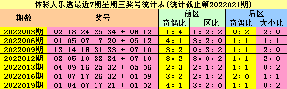 体彩大乐透上周星期三(第2022019期)奖号为01 04 07 17 21 + 01 02,其中前区奖号奇偶比为4:1,三区比为3:2:0,后区奖号奇偶比为1:1,大小比为0:2。