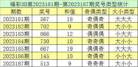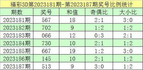 福彩3D第2023187期回顾:奖号为513,奖号奇偶比为3:0,大小比为1:2,和值为9,类型为组六。
