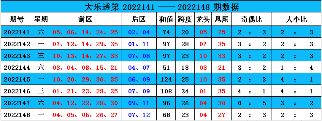 大乐透第2022148期奖号为:前区04 05 06 26 27,后区07 12。前区号码和值68,跨度为23。后区号码和值为19,跨度5。