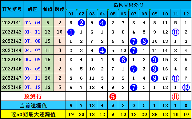后区分析:上期后区开出号码07、12,为大大、奇偶组合。