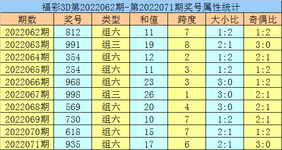 072期黄欢福彩3D预测奖号:大小奇偶和值跨度