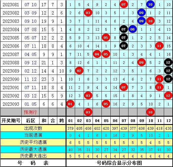 后区分析:后区上期开出号码01+05,和值为6,跨度为4。最近10区后一区(01-06)开出7个号码,断区5次,后二区(07-12)开出13个号码,断区2次,本期后一区注意号码:02、03、06;后二区注意号码:07、10、12。