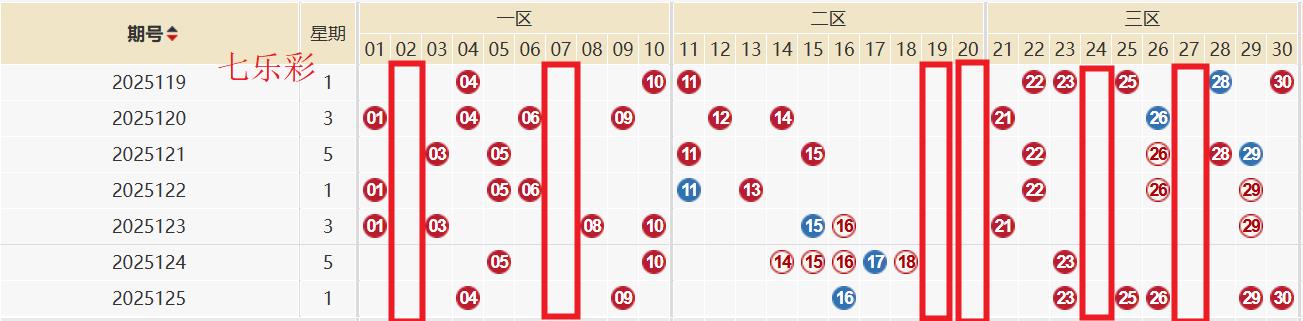 近七期开奖中一区出号数量为2+4+2+3+4+2+2=19枚,整体占比为38.8%;二区出号数量为1+2+2+1+1+4+0=11枚,整体占比为22.4%;三区出号数量为4+1+3+3+2+1+5=19枚,整体占比为38.8%。一区整体占比略高于均值,周期内呈现下降趋势.二区占比低于均值,呈现下降趋势。三区占比略高于均值,呈现上升趋势。基于动态平衡干预以及波动趋势衡量,本期七乐彩开奖三区比倾向于1:2:4。重点关注周期遗漏的2,7,19,20,24,27。