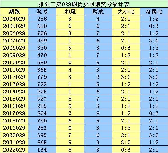从2004年至今排列三已开出6449期奖号了,本期为排列三2023年第029期开奖,历史同期已出现19次奖号: