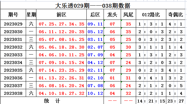 上期回顾,大乐透第2023038开奖,本期奖号:前区04 10 18 27 32;后区10 12,当期前区号码大小比为3:2,三区比2:1:2,奇偶比1:4。前区未开出连号,未开出重号。