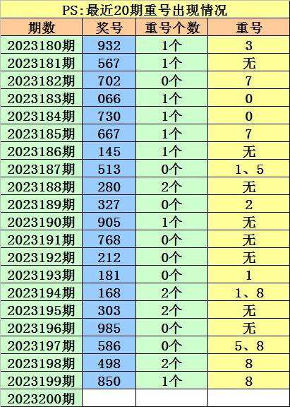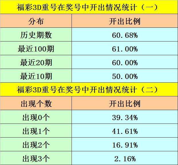 最近100期开奖中,含有重号的奖号有61期,最近20期含有重号的奖号有12期,最近10期含有重号的奖号有5期。本期注意重号落号。