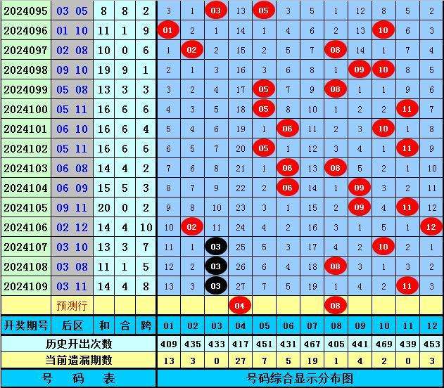 后区分析【一区01-04,二区05-08,三区09-12】:上期后区奖号为03和11,分别落在第一、三区,近50期后区三区比为26:40:34,近10期三区比为4:7:9,本期注意第一、二区号码出现,关注两码04+08。