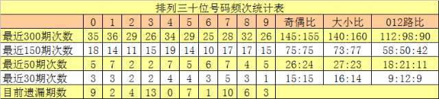 十位号码:前50期走势最活跃的号码为:1、4、7开出7个;走势最冷的号码为:2、3开出2个,8开出4个。十位号码012路比开出18:21:11,大小比开出27:23。本期十位排除两码:3、8,参考号码0、4、9,胆码关注9。
