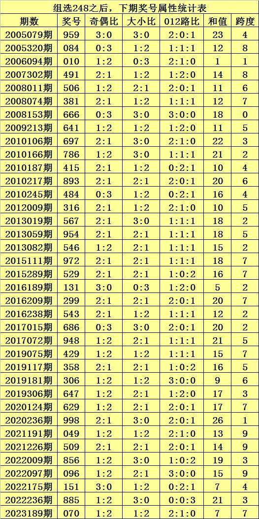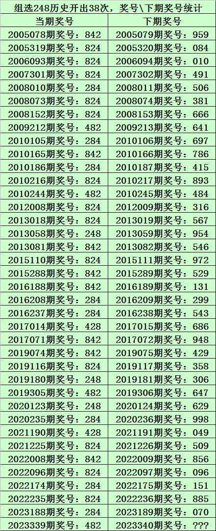 二、组选248分析:排列三历史上已开出38次组选号码248了,其奖号和下期开出奖号统计如下: