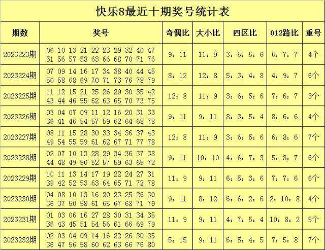 福彩快乐8第2023232期开奖回顾:02 03 04 09 14 16 22 26 30 35 36 47 56 58 60 62 63 66 76 80,其中奖号奇偶比为5:15,大小比为9:11,四区比为6:5:4:5,012路比为7:5:8,重号7个:03、16、30、35、36、56、66。
