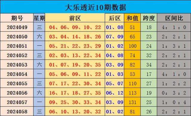 和值分析:上期前区奖号和值81,预测本期和值将会上升,参考和值将会开在103左右。
