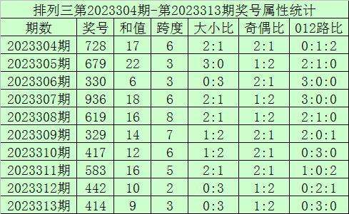 上期回顾:排列三第2023313期开奖号:414,奖号和值:9,奇偶比1:2,大小比0:3。