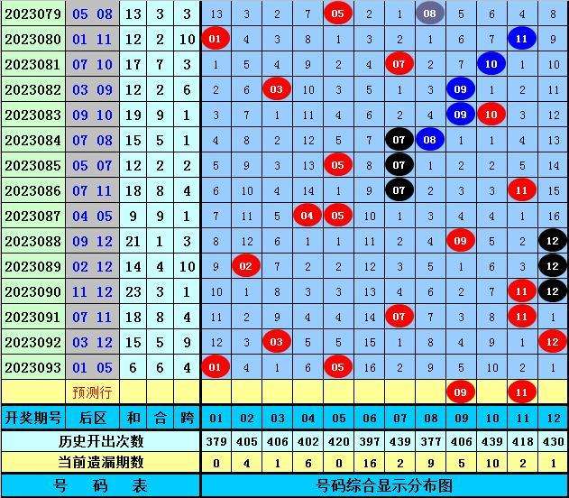 后区分析:上期后区开出第一区和二区号码01+05,最近10期后区三区落号比为0:2:0,最近5期后区三区落号比为1:0:1,本期后区号码大范围关注01、09、10、11、12,后区精选两码09、11。