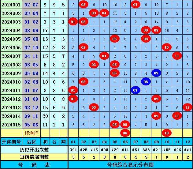 后区分析:上期后区开出2路+0路号、一质一合组合,最近10期后区奖号012路比为7:5:8,质合比为12:8,本期看好后区在02、03、06、09、10之内落号,精选后区奖号06、10。