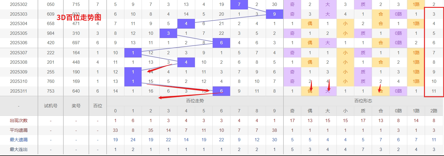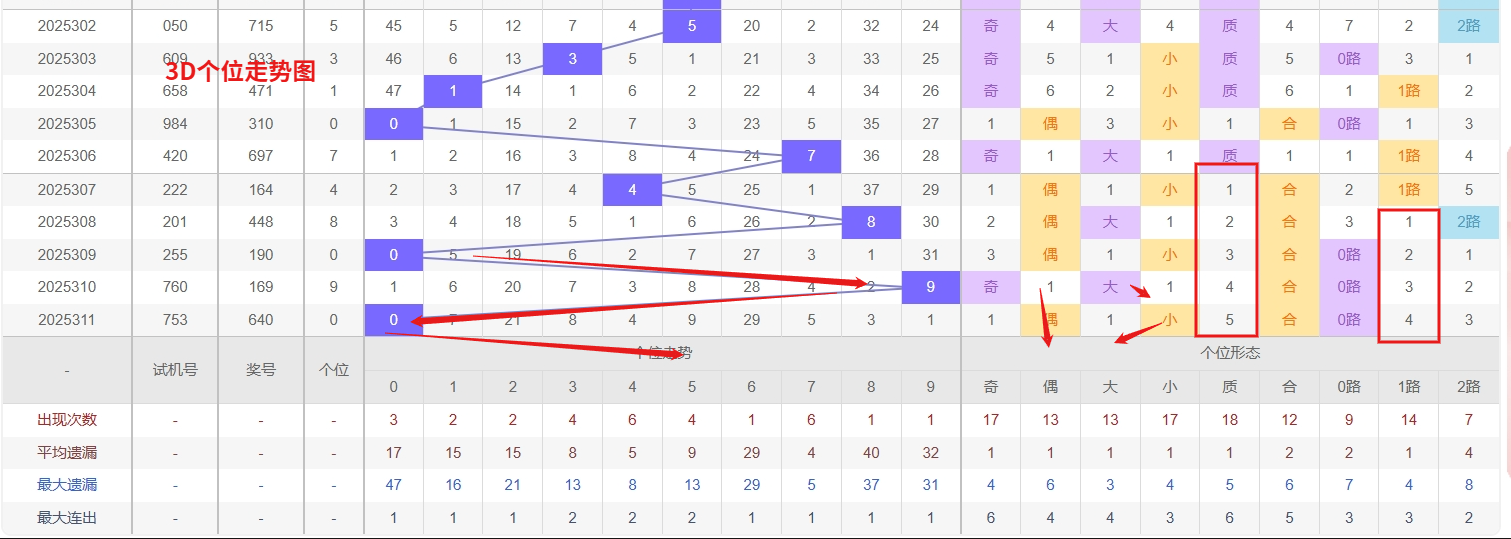福彩3D个位分析:第2025311期个位开出号码0属于小偶数前端,从以上个位走势图中可以看出近100期的大小比约为53:47奇偶比约为54:46大小奇偶数据上有点差异有需求但不是太明显,不太好看这时就要借助连线走势和遗漏数据来帮助我们缩水号码。上期个位落号“0”小偶数0路号码球,号码开出了9振幅,连续多期的小振必被大振幅取代幅符合我们的预期,那么本期我们在个位考虑振幅走势走前依然要转变思路考虑大振幅,具体考虑(2-6)个振幅是我们主要的方向,那么在对个位落号情况进行系统的分析时我们可以明显的看到个位号码走势呈现大范围震荡,尤其是在号码的落位特点上表现的尤为突出,那么本期我们在个位分析时就要注意号码的风险,避免出现踏空。近期3D个位走势分析,号码6和8已持续多期未开出,处于明显的冷态阶段,历史数据表明冷号在经历较长遗漏后通常具备较强的回补动能,值得重点关注。与此同时,号码3近期表现活跃,呈现出稳定的热号特征,短期内仍有持续开出的可能性。在冷热交替的走势中,采取均衡防守策略:一方面关注冷号6和8的可能反弹,另一方面对热号3的延续态势保持警惕,因此福彩3D第2025312期个位看好13689。本文由彩虹多多钱是生命动力所著,请勿转载
