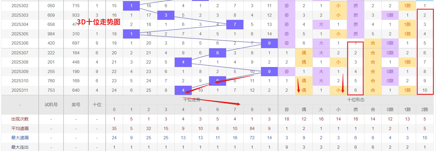 福彩3D十位分析:第2025311期十位开出号码4属小偶数号码前端。以历史100期数据为例十位奇偶比约为46比54,大小比约为52比48近期大小相差2点,根据求均衡的规律开出小数的概率比大数高一点。上期我们分析奇数经过连续回补后有走偶数的可能,开出奖号4小偶数符合我们的预期。近期3D十位走势来看,号码0和2确实处于明显的冷态阶段,遗漏周期相对较长,理论上存在回补的可能性。冷号一旦开始回补,往往会出现短期内的密集开出,因此对0和2的防守值得重点关注。与此同时,号码7在近阶段表现非常活跃,属于当前的热号形态,热号延续开出是常见趋势,所以对7的跟进仍然不能放松。综合来看,在冷热交替的节点上,一方面要防范冷号回补带来的转折机会,另一方面也要警惕热号的持续强势,所以福彩3D第2025312期十位推荐02579。本文由彩虹多多钱是生命动力所著,请勿转载