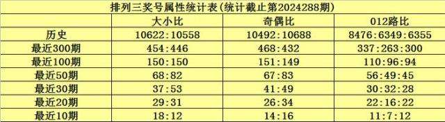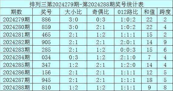 上期回顾:排列三第2024288期奖号为810,奖号012路比为1:1:1,奇偶比为1:2,大小比为1:2,和值为9,跨度为8。