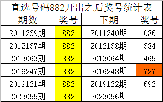 从上表统计可以看出,直选号码882开出之后,其下期奖号: