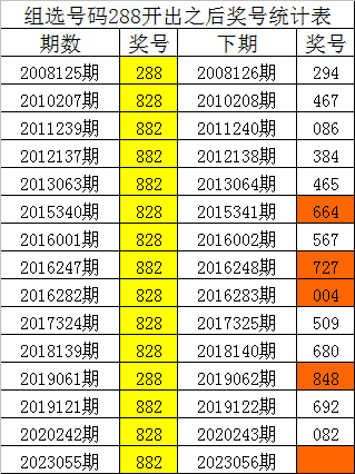 体彩排列三组选号码288历史上出现了15次,其下期奖号分别为:294、467、086、384、465、664、567、727、004、509、680、848、692、082,详细统计见下表: