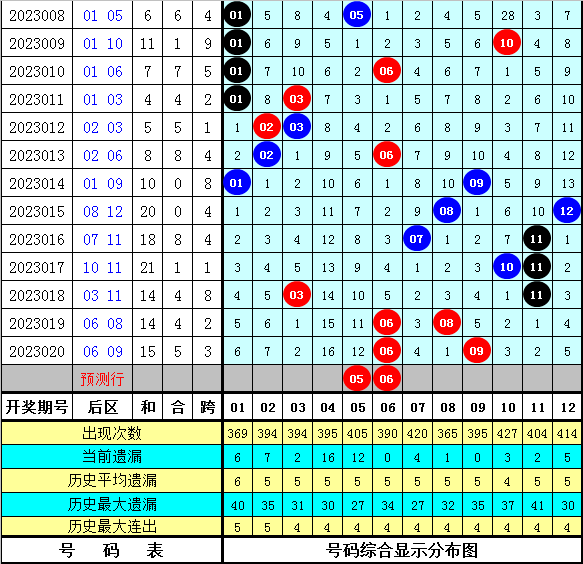 后区分析:后区上期开出号码06+09,和值为15,跨度为3。最近10区后一区(01-06)开出10个号码,断区3次,后二区(07-12)开出10个号码,断区3次,本期后一区注意号码:02、04、05、06;后二区注意号码:09、11。