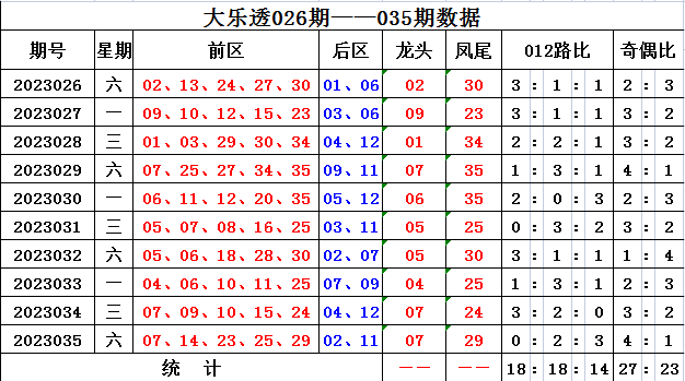 上期回顾,大乐透第2023035开奖,本期奖号:前区07 14 23 25 29;后区02 11,当期前区号码大小比为3:2,三区比1:2:2,奇偶比4:1。前区未开出连号,开出重号07。